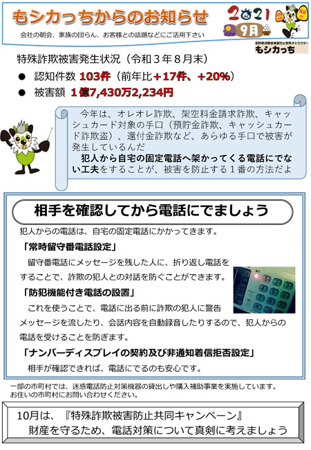 今月の長野県から届いたチラシには、被害を未然に防ぐための防犯機能付き電話の利用などの対策が載っています。