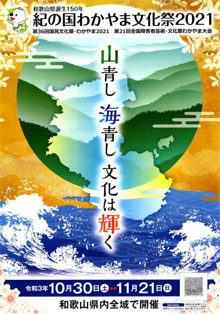 10月30日(土)から11月21日(日)まで、「山青し海青し文化は輝く」をテーマに「紀の国わかやま文化祭2021」(「第36回国民文化祭・わかやま2021」「第21回全国障害者芸術・文化祭わかやま大会」)が和歌山県内各地で開催されます。