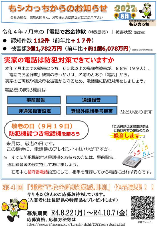 今月の長野県からの啓蒙チラシでも防犯機能付きの電話機を使うことを勧めています。