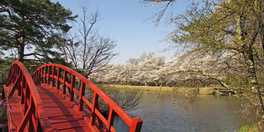 池の中の島につながる太鼓橋も夜はライトアップされ、花筏が散りばめられた水面に映る橋はこの時期だけの特別な風景です。