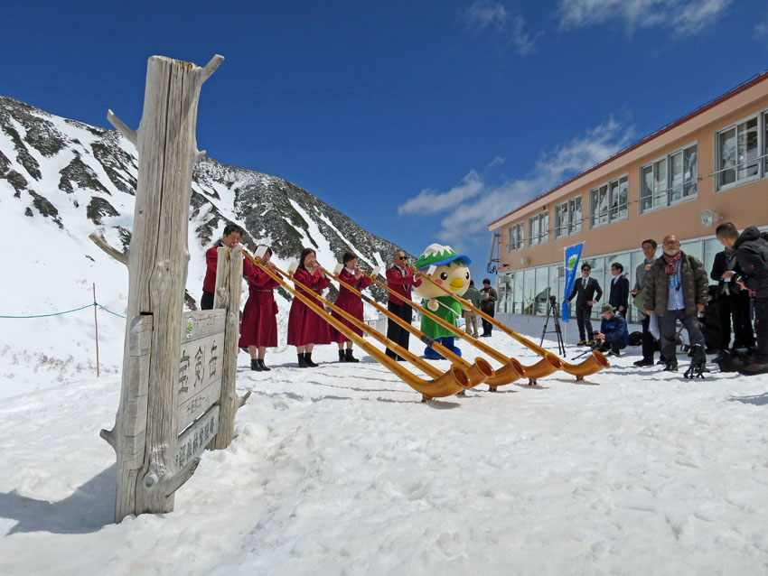 雪を掘りおこして現れた祠を前で関係者が今シーズンの山の安全を祈願した後、アルプホルンの演奏が行われ、居合わせた登山客の皆様もアルプスの雰囲気を楽しまれたようです。