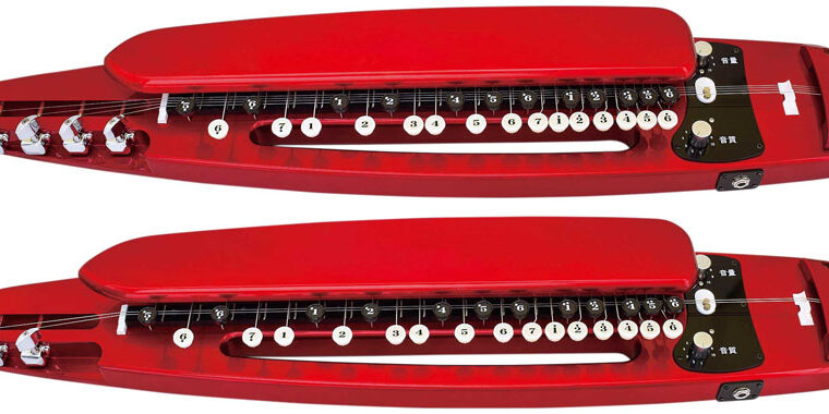 エレキ琴は胴の部分が共鳴箱になっていないタイプの大正琴で、生音は小さいものの、胴が反響しないことで弦の振動と干渉しあうことがないため、音の伸びが良いのが特徴です。