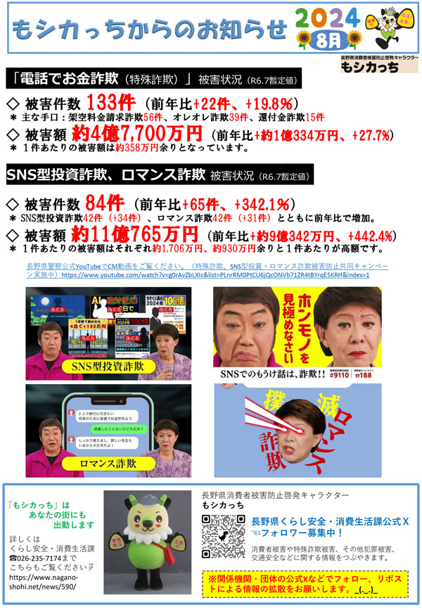 長野県では、長野県出身の美川憲一さんが出演する特殊詐欺防止のテレビCMが流れています。