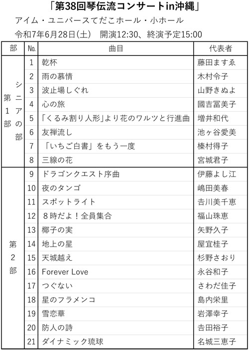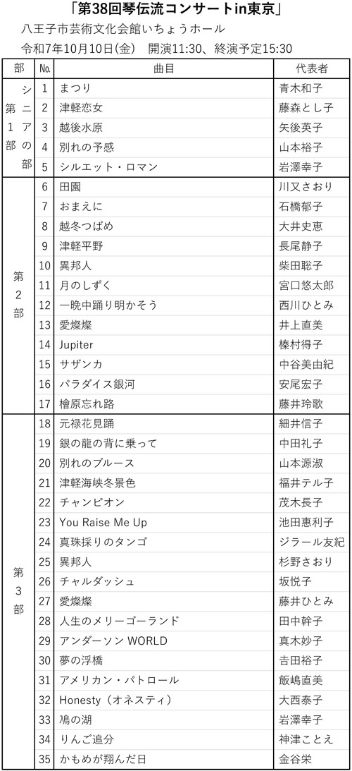 4月142025琴伝流ニュース「第38回琴伝流コンサート」の出場グループが決まりました。 カテゴリ: 琴伝流ニュース2025年4月14日 この記事を共有する Share on XShare on X Share on FacebookShare on Facebook Post navigation前へ前の記事:大正琴協会正会員の琴伝流の皆様へ次へ次の記事:「世界の果てまでイッテQ!」に感謝します関連記事「琴伝流大正琴第24回山形県大会」のご案内2025年7月23日夏季休業のお知らせ2025年7月18日「琴伝流大正琴第39回東京大会」のご案内2025年7月17日令和7年度公益社団法人大正琴協会普及功労者表彰2025年7月14日