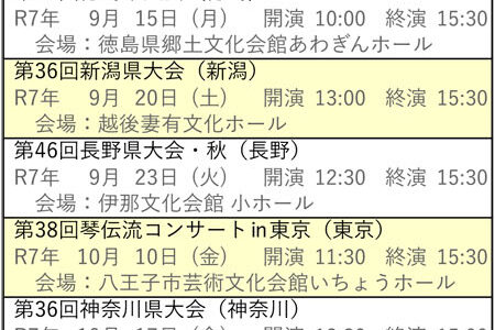 7月222025 演奏会のご案内 全国大会・県大会のご案内 演奏会のご案内2025年7月22日 向こう6ヶ月分の琴伝流および公益社団法人大正琴協会主催の全国大会や県大会をご案内します。 グループが心をひとつにして演奏する大正琴音楽をお楽しみください。 ※開演・終演時間は都合により変更する場合があります。 ※「お知ら… 続きを読む