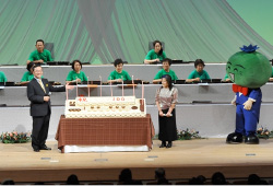 大正琴が1912年9月9日に発売となり、ちょうど100歳の誕生日となった2012年9月9日に国民文化祭「大正琴アンサンブルの祭典」の式典として、開催地徳島県の飯泉嘉門知事にもご出席いただき「大正琴100歳おめでとう」のセレモニーを行いました。大正琴の演奏に合わせて観客の皆様が「ハッピーバースデー」を歌い、1.6メートルある巨大な大正琴ケーキのロウソクを吹き消して大正琴の大きな節目を祝いました。