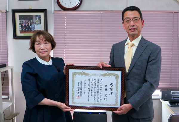 令和4年1月の海部俊樹理事長ご逝去に伴い協会初の代表理事1名体制となりながらも、無事2年間の任期を終えた北林会長に対し、令和4年5月の役員改選時に感謝状が授与されました。