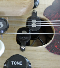 一方、内蔵マイクのデメリットは、磁気信号を拾うのに一番良い位置はピックが行き来する共鳴穴の位置であるため、マイクを取り付けると共鳴穴の一部がふさがれてしまいます。大正琴を一人で弾いていた時代は、演奏者に良い音が聴こえることが最も大切でしたが、大正琴アンサンブルを聴いていただく時代の今は、内蔵マイクの方が適しているとの考えから、琴伝流では内蔵マイクを採用しています。琴伝流が音響メーカーと開発した大正琴用マイクは、他社の大正琴にも採用されています。