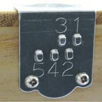 もう一つ、琴伝流のテールピースには小さな工夫が隠されています。琴伝流のテールピースをよく見ると、どの弦をどこに引っかければよいか分かるよう、弦の番号が刻印されています。これも大正琴愛好者の立場に立った琴伝流の小さな心遣いです。