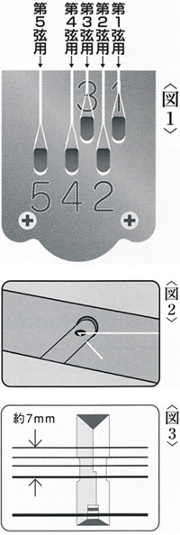 ⑤弦にある程度はりが出てきたら上駒、下駒に乗せます。上駒には溝かあるので弦を乗せる位置が分かりやすいのですが、下駒に乗せるときには注意が必要です。下駒には1弦~3弦用の山と、4弦用の山があります。今まで張ってあった弦の跡が残っていますので、よく見て新しい弦を元あった弦の跡に乗せてください。1弦~4弦の間隔は下駒付近で約7mmが適当です。<図3>この下駒の位置と弦の乗せ方が正確な音程(音の高さ)と音色を左右する最も重要なポイントです。