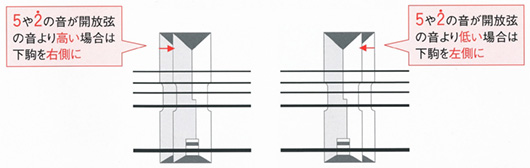 大正琴をはじめ弦楽器は、下駒の位置が適切でないと高音域の音程が合わないことがあります。特に合奏のときはこの調整不足が音のにごりの原因となります。ご購入時は最良の位置に調整してありますが、弦を張り替えた後などは念のためオクターブ調整(駒調整)を行ってください。