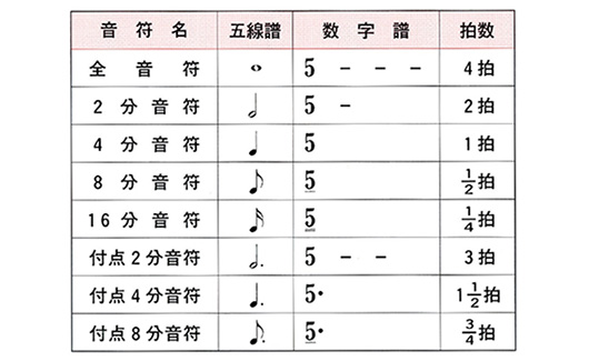 ②数字譜では音の長さを次の表のように表します。また琴伝流の譜面では、音符の長さ分の間隔をおいて各音符が割り振りされていますので、見た目でも音の長さがわかりやすくなっています。