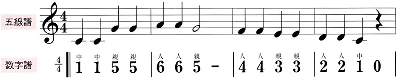 ①数字譜では音の高さを数字と点と#で表しています。同じ数字でも下に点が付いていたら低い音域、上に点が付いていたら高い音域を表しています。また数字の左上に#が付いていたら黒の音階ボタンを表しています。このように数字譜は音階ボタンと同じ記号で書かれていますので、譜面とボタンを合わせるだけで簡単に正しい音が出せるようになっています。